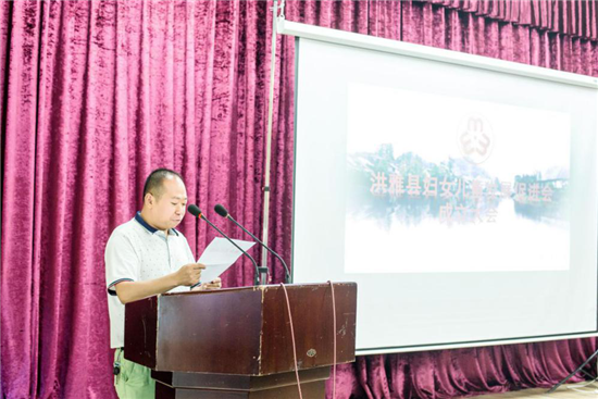 洪雅县民政局副局长何雄宣读《洪雅县民政局关于同意成立洪雅县妇女儿童发展促进会的批复》,并预祝促进会成立大会取得圆满成功