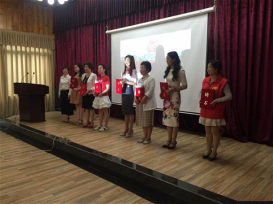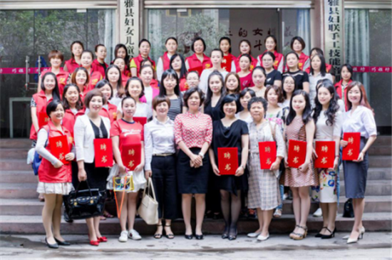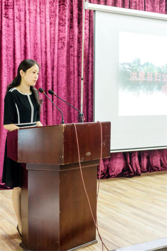 洪雅县副主席冷晓玲宣读《洪雅县妇女联合会关于同意洪雅县妇女儿童发展促进会聘请机构负责人的批复》,并向促进会副会长颁发聘书,县委常委、统战部部长万勤芳向促进会首任会长严光玉颁发聘书并为促进会授牌。