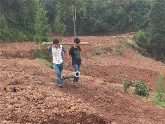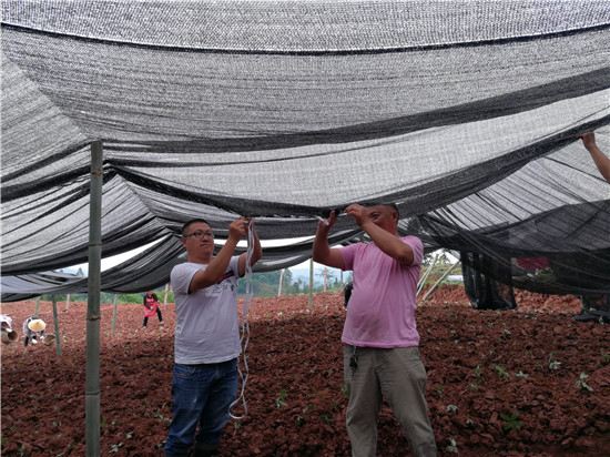 第一书记黄一舒在药材种植基地搭建遮阳网(左一)