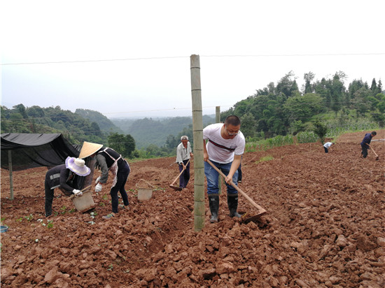 第一书记黄一舒与村民一同耕地育苗(右一)