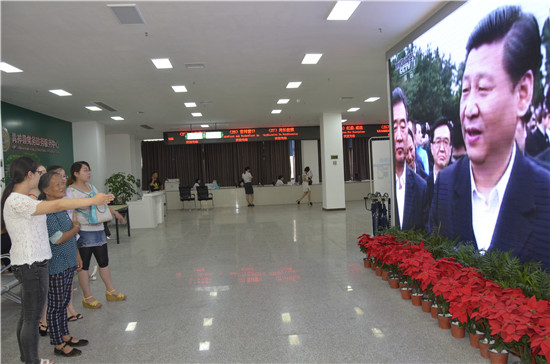 前来办事的群众正在县党务政务服务中心大厅观看《将改革进行到底》