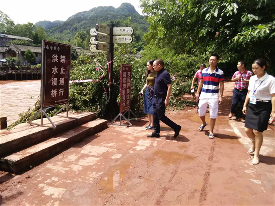 眉山市旅游局局长黄劲松等领导查看柳江古镇灾情,县旅游发展中心副主任周勤等陪同