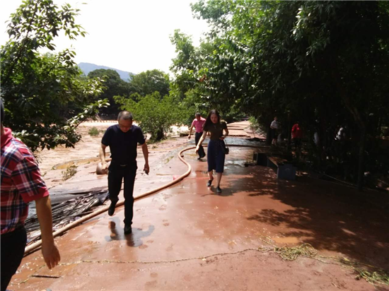 眉山市旅游局局长黄劲松等领导泥泞中查看柳江古镇灾情