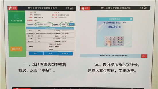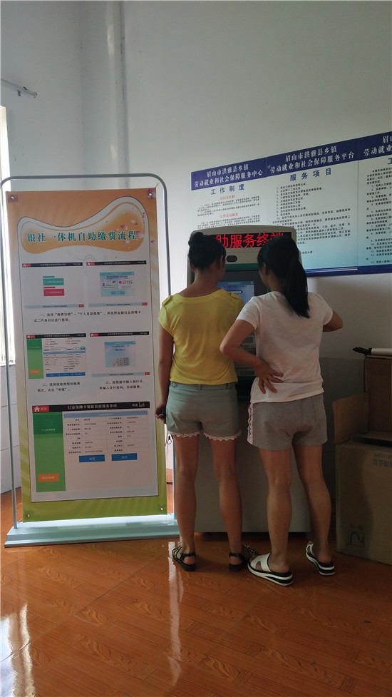 四川新闻网眉山8月9日讯(张小洪 文/图)近日,经银行专业人员调试后,洪雅县三宝镇社保自助服务终端机正式启用了。参保人员通过插入本人社会保障卡就可以实现自助缴纳社保费、修改密码、查询信息、打印参保明细;通过扫描二代身份证轻松办理社保卡挂失业务;了解相关政策法规,免去以往在社保大厅或银行排队办理业务的烦恼。