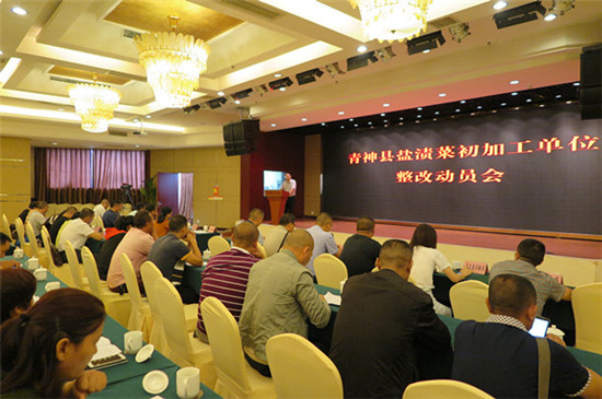 会上,县食安办主任解读了《青神县盐渍蔬菜初加工单位整改实施方案》,县农牧局、县环保局负责人作了表态发言。会议要求,各盐渍菜初加工单位要按照整改要求,自觉主动进行整改,凡整改不到位的一律不准收菜加工。各职能部门要认真履职,加强配合,形成工作合力,把盐渍蔬菜初加工单位整改及验收工作落到实处,确保全县环境保护工作再上新台阶。