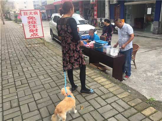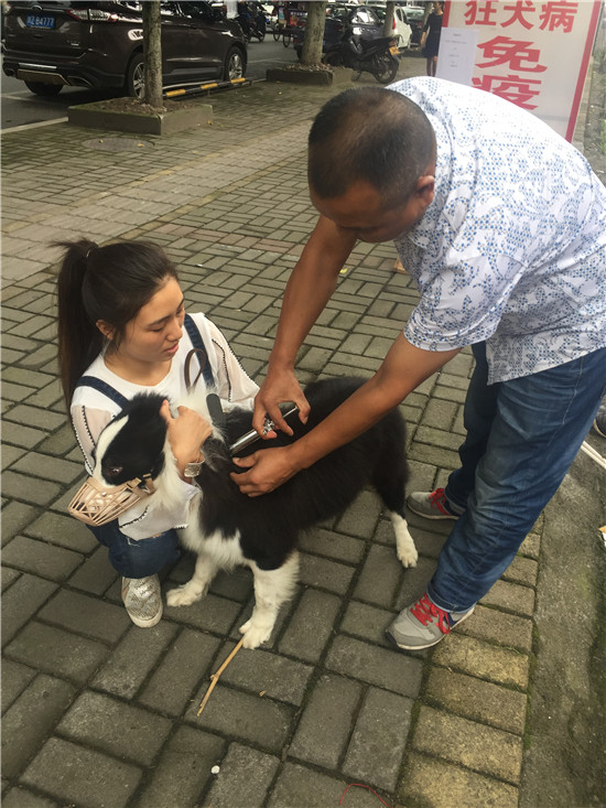 当天,工作人员在洪川镇畜牧兽站定点为犬只进行注射疫苗。在疫苗接种点现场,工作人员正为一位女士的爱犬注射狂犬疫苗。打完疫苗,工作人员登记了此次免疫信息,并向其发放了狂犬病宣传资料、免疫牌、免疫证和准养证。