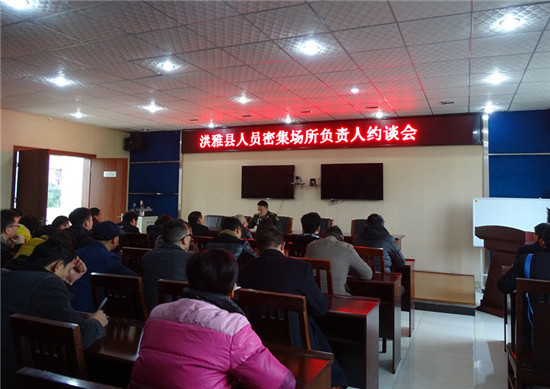 四川新闻网眉山12月25日讯(孙阳容 文/图)为深刻吸取近期火灾事故教训,进一步做好今冬明春火灾防控工作,切实减少火灾事故的发生,确保全县火灾形势持续稳定。12月22日,洪雅大队组织全县宾馆、酒店、超市、网吧、KTV等人员密集场所负责人召开了约谈会。会议由大队长刘振主持。