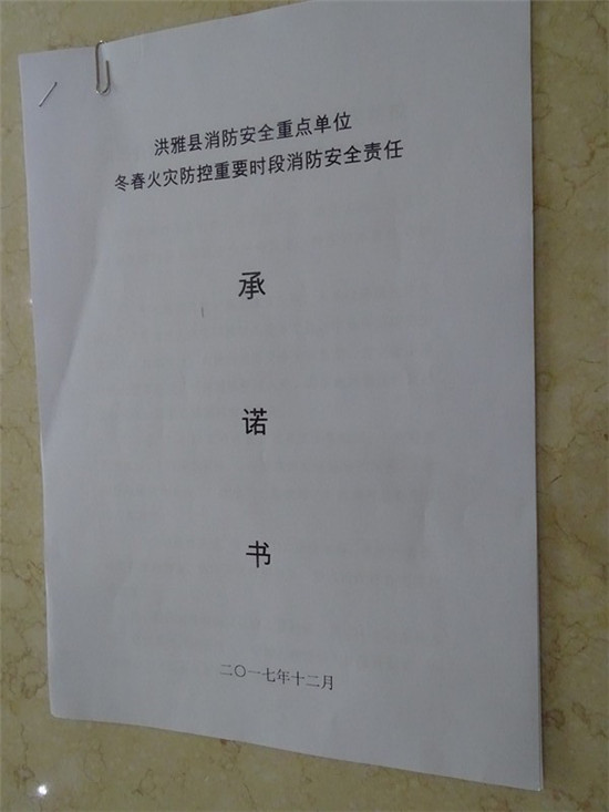 四川新闻网眉山1月12日讯(孙阳容) 为全面做好今冬明春火灾防控工作,切实减少火灾事故的发生,确保全县火灾形势持续稳定。洪雅县消防大队组织全县51家重点单位签订了“洪雅县消防安全重点单位冬春火灾防控重要时段消防安全责任承诺书”。