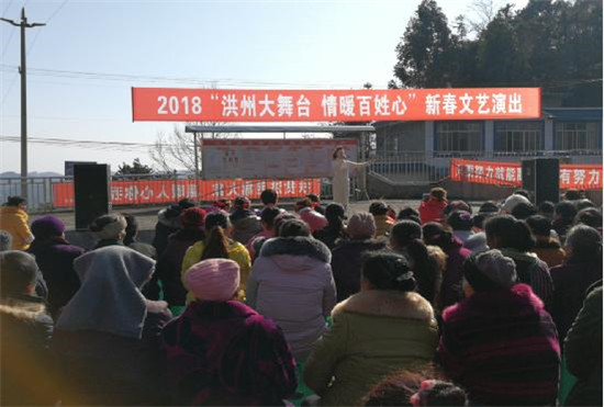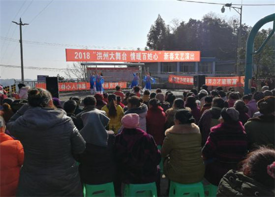 四川新闻网眉山1月17日讯(黄翔 图/文)1月16日上午,洪雅县汉王乡联合村村级文化广场上人声鼎沸,近200余名村民聚集在此,观看2018“洪州大舞台 情系百姓心”新春文艺演出,听讲党的十九大精神。