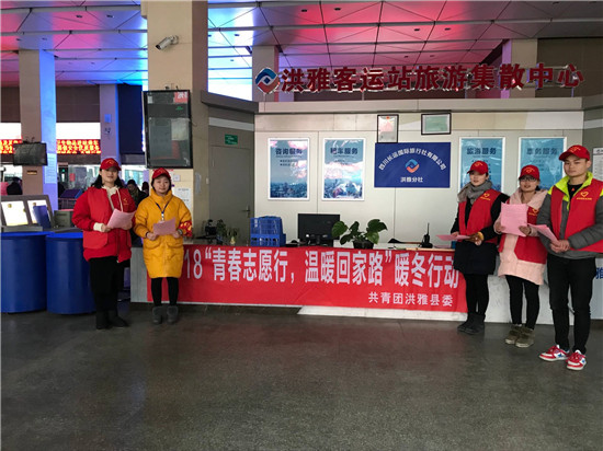 四川新闻网眉山2月2日讯 2月1日,共青团洪雅县委组织6名志愿者前往洪雅县客运站开展以“青春志愿行 温暖回家路”为主题的春运“暖冬行动”。