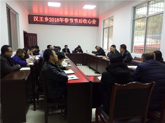 四川新闻网眉山2月22日讯今(22)日上午9点,洪雅县汉王乡党委政府组织召开了2018年春节节后收心会。要求全体乡、村干部要收心拢神,立即调整工作状态,把思想和精力转到工作上来,迅速集中心思,持续抓好作风,及早部署工作;要谋篇布局,强力启动各项工作,突出抓好小额保险征缴、工会会员卡办理等季节性工作,抓好重点项目推进、安全和稳定工作;要强化领导,确保目标任务完成,加强督促抓落实、改进方法抓落实、强化领导抓落实。做到心中想全年、突出抓首季、致力保开局,共同建设美丽繁荣和谐汉王!