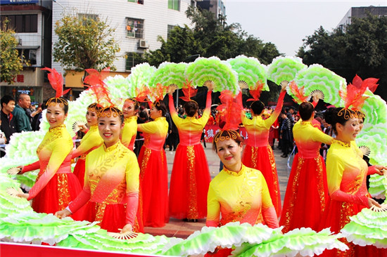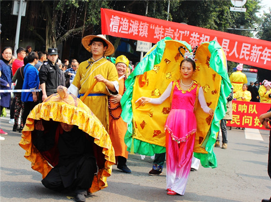 巡游节目一个接着一个。由槽渔滩镇村民带来的首批市级非物质文化遗产《蚌壳灯》,将活动不断推向高潮。《蚌壳灯》演绎了青衣江蚌壳仙子和打渔郎的美丽爱情故事,生动逼真的表演寄托着人们对美好生活的无限向往。