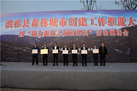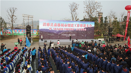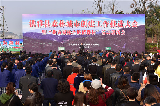 四川新闻网眉山3月14日讯(伍迪 袁桂林 图/文)3月14日,洪雅县2018年森林城市创建工作推进大会暨“我为森林之城植棵树”活动举行。县委书记阳运良,县委副书记、县长宋良勇,县委常委、统战部长万勤芳等县领导,县级各单位、部门主要负责人及班子成员、洪川镇社区代表、学生代表、志愿者代表共计1000余人参加活动。