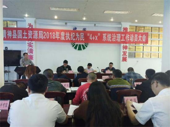 四川新闻网眉山4月18日讯 为推动全面从严治党向纵深发展,巩固发展良好政治生态,4月17日,青神县2018年度执纪为民“4+X”国土资源系统治理动员大会在县国土资源局四楼会议室召开。县委常委、总工会主席戴宇、县纪委“4+X”治理办主任罗志清、国土局全体干部职工参加了此次会议。