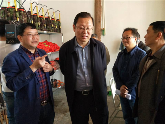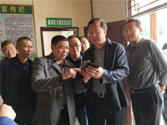 在柳江镇洪江村,冉登祥详细检查了洪江村森林防火“二三四工程示范村”建设情况,了解了全村森林资源管护情况,巡山员工作情况,现场检查了扑火工具维修保养情况。