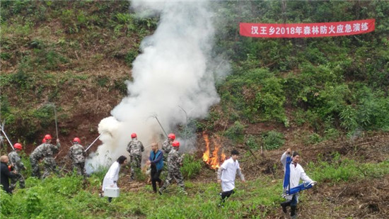 演练模拟汉王乡建设村(原万祠村)发生森林火灾,拉响警报,乡党委书记、乡长成立临时应急救援指挥部,启动应急预案,靠前指挥。汉王乡民兵应急救援分队、青年志愿者分队奔赴现场扑灭火情,汉王乡卫生院医护人员迅速从火场抢救受伤人员。乡林业站调查起火原因,统计上报过火面积。