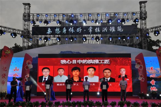 会上,眉山市总工会副主席缪川勋为6位“我心目中的洪雅工匠”颁发了荣誉奖牌。四川省洪雅青衣江元明粉有限公司采矿、爆破高级工程师、总工程师张春太,洪雅县高庙古镇酒业有限公司总经理、国家一级品酒师戴健勇,眉山电子职业技术学校教研组长罗文,四川丰元机械制造有限公司冶炼班班长姚大勇,洪雅县天文机械有限责任公司总经理杨天文,洪雅县洪川汽车修理厂维修技师黄时均荣获2018“我心目中的洪雅工匠”荣誉称号。