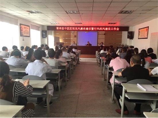 四川新闻网眉山5月4日讯 青神县中医医院于5月3日召开2018年度党风廉政建设暨政风行风建设工作会。医院班子成员、中层干部、重点岗位工作人员、医生及药品、器械、耗材等供货商代表共计100余人参加会议。会议由党支部书记张红英主持,县卫计局纪检组长商志忠到会指导工作。