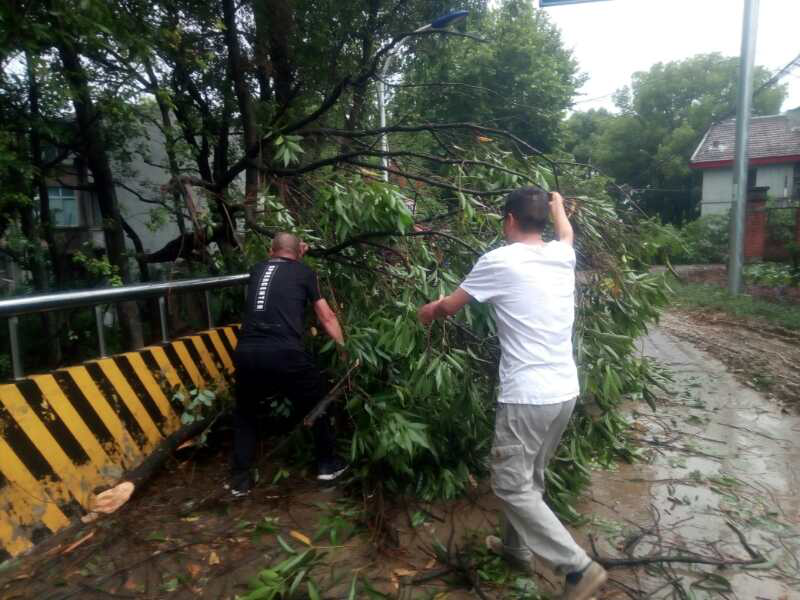 建华社区的树木被大风雷电击倒,社区干部第一时间到达现场查看情况,在确保安全的情况下及时清理折断的树木,快速恢复道路畅通。