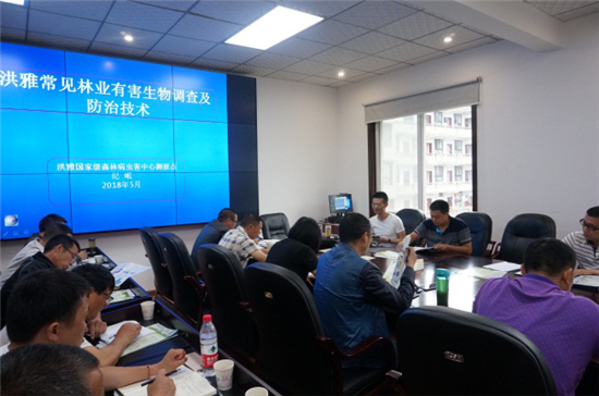 四川新闻网眉山5月25日讯(纪岷 文/图)为加强全县森林资源保护,提高基层森防人员测报和防治技术。5月24日,洪雅县森林病虫防治检疫站在县国有林场举办了一期林业有害生物监测防治技术培训会。国有林场各管护站负责人、测报人员和林场场部相关森防工作人员50余人参加培训。