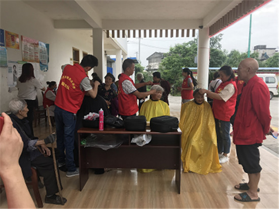 “我想前面的头发再剪短一点……”场镇社区的张大爷和理发师志愿者交流起对发型的要求。当日,理发师志愿者们早早就带着理发工具来到了龙女村办公室前,为排队等候的老人理发,他们认真听取每一位老人对发型的要求,共为40多位老人进行了服务,老人们对理发师们的服务均表示满意。