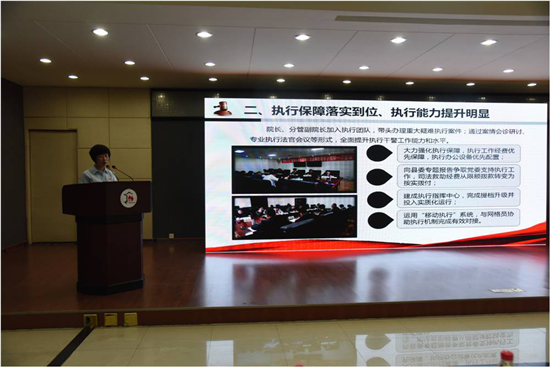 青神法院作为眉山市一家较小的基层法院,“小而不畏,难而不惧”,在院党组的领导下,充分准备积极应战。本次大比武活动分为书面报告和现场竞赛两个部分,充分考察各个基层法院的综合实力水平和院长主体责任。书面报告通过法院自评、院长互评、随机抽查卷宗审定等多种形式全面评查。2016年以来,青神法院围绕《关于落实“用两到三年时间基本解决执行难问题”的工作纲要》所确定的“四个基本”工作目标,全面贯彻落实两年内基本解决执行难工作部署要求,突出问题导向,着力构建综合治理执行难工作格局、大胆创新执行工作机制、不断规范执行权力运行、始终聚焦胜诉权益保障,实现了执行工作模式重大转变、执行工作质效大幅提升,执行工作外部环境明显改善,当事人权益最大限度实现,因此赢得了评审组的一致肯定。现场竞赛环节需要院长结合PPT演示,汇报工作成效并现场回答随机抽取的问题。廖敏院长以饱满的信心全方位的为在场评审团展现了青神法院“基本解决执行难”以来的做法和成效。面对现场随机抽取的问题,沉着冷静、应对如流,赢得现场评审和观众们的频频点赞。