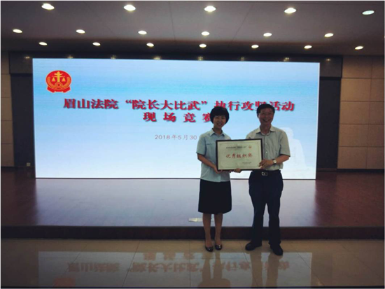 最后,青神法院以综合评分第一名获得了眉山市基层法院“院长大比武”优秀组织奖,廖敏院长获得了“先进个人”。基本解决执行难已到攻坚决胜的关键阶段,青神法院将勇于担当、全力攻坚,确保目标任务落地落实,为新时代人民法院司法事业的新发展和全市改革发展稳定大局作出新的更大贡献。
