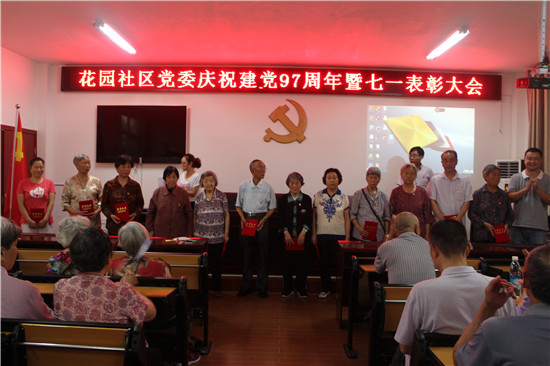 “我宣布,花园社区庆祝建党97周年暨庆“七一”表彰大会正式开始”随着社区党委书记杨凯话音一落,庆祝大会正式拉开了序幕。全体党员起立,面向党旗,跟随领誓人重温入党誓词,嘹亮的声音响彻整个会场,把大家带回到了接收为预备党员光荣宣誓的那一刻。接着,花园社区党委宣读关于表彰2017年优秀党支部书记和优秀党员的决议,并由青城镇党委副书记、镇长刘永生为优秀党员颁发荣誉证书。表彰会后,刘镇长作出重要讲话,要求社区班子以及全体党员同志要统一思想,增强政治意识,同时要积极向优秀、先进代表学习,充分发挥好党员带头模范作用,真抓实干,全力支持配合镇党委工作任务安排,为建设美丽幸福青神贡献一份力,最后为全体党员同志送上了节日的祝福。刘镇长的话言简意赅,意味深长,为社区全体党员同志指明了努力方向,全场爆发出热烈掌声。最后,社区党委书记杨凯以“忆党史 话七一”纪念建党97周年为主题,为全体党员上了一堂精彩的党课。党课由中国共产党的成立、七一建党节的由来、七一我们这样庆祝、七一优秀诗歌赏析四部分组成,通过PPT结合实例讲解,将全体党员同志带回到建党之初的峥嵘岁月,带领全体党员重温历史,铭记七一,最后,在《党啊,亲爱的妈妈》歌曲的感召下,全体参会人员和声歌唱,将此次七一活动推向了高潮。