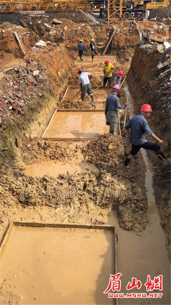 7月10日,站在东坡区三苏镇三苏文化公园建设项目现场,记者看到工人们正在进行桩基的浇筑,几米深沟已初见雏形。由于受暴雨影响,工人们除了赶工期外,正加紧抽排雨水。