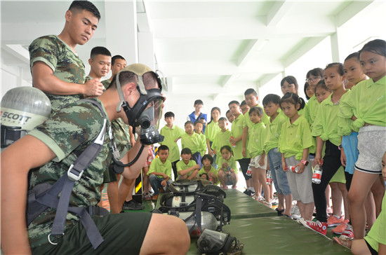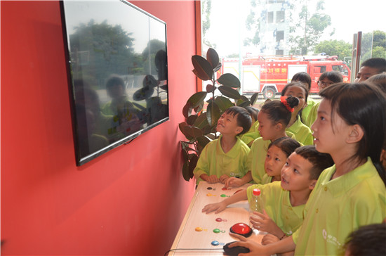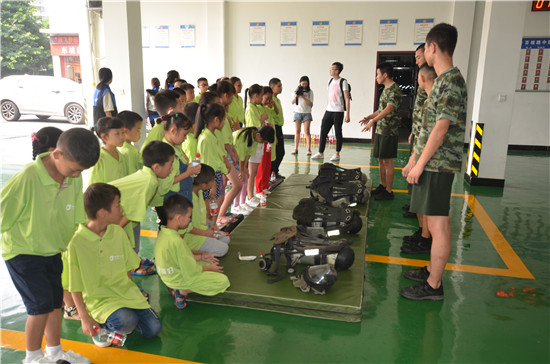 小朋友进入营区后,在电影院观看了“119对你说”专题片,宣传片引起了大家对于火灾隐患的重视,知道了火灾对大家的生活和工作的影响。来到车库,大家看到大队水罐、泡沫、云梯等先进消防车一字排开,纷纷发出了机动的兴奋的叫喊声,官兵为现场学生展示了与了解了空气呼吸器、液压破拆工具、钢筋切断器等一批抢险救援器材的用途和使用方法,让学生们深入了解了消防官兵的日常工作、职责。与此同时,消防官兵借此机会向学生们讲解了消防安全知识,让他们了解了在日常生活中如何用火、防火、灭火以及火灾发生时如何自救和逃生等消防常识。接着,官兵向大家介绍了地毯上摆放的各种战斗服和救援器材装备;“这是灭火战斗服,消防员穿上它去扑灭熊熊大火!这种是抢险救援服,消防叔叔穿着他去营救遇到危险被困的人们!”同时,也让好奇的同学们穿上消防战斗服、背上空气呼吸器,足足的过了一把做消防员的“瘾”。