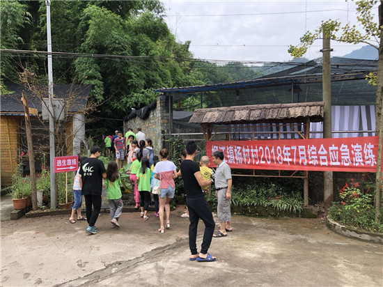 应急演练模拟连续遭受强降雨,经查看易发生山洪灾害,威胁杨村村60多名群众生命财产安全,即启动应急预案。迅速敲锣,挨家挨户催促群众赶快从家中出来,进行统一集合、快速有序的将60多名群众转移到临时避险安置点。整个演练在规定时间内完成,达到了预期目标,取得了良好的效果。
