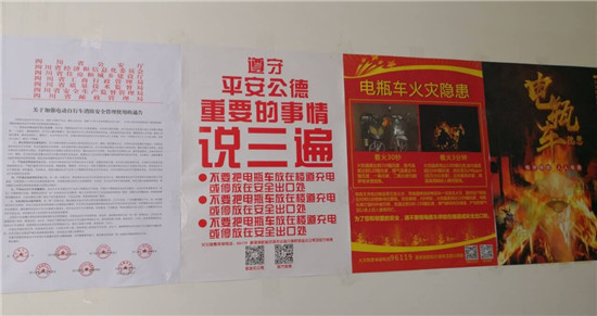 公告和海报被张贴在公示栏、商场出入口、巷道的显眼位置。旨在提醒广大群众要安全使用电动车,不要在建筑门厅、内走道、楼梯间等部位停放电动车及为电动车充电,呼吁广大群众从我做起,共尽一份义务、公担一份责任、共同防范电动自行车火灾发生。针对现今微博微信等新媒体影响力广且方便快捷的特点,社区消防志愿者还充分发动群众扫描关注“东坡消防”微信公众号,充分发挥其作用。