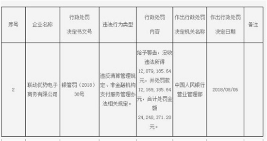 8月6日,央行营业管理部开出大额罚单,严惩支付机构为非法交易提供支付服务的违法违规行为。联动优势电子商务有限公司(以下简称联动优势公司)被警告,并被没收违法所得1207.92万元,并被罚款1216.92万元,合计被罚没2424.84万元。
