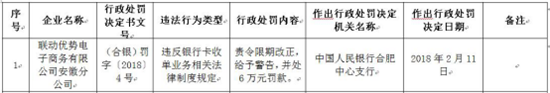 2月11日,联动优势安徽分公司违反银行卡收单业务相关法律制度规定,央行合肥中心支行责令其限期改正,并给予警告,并处6万元罚款。