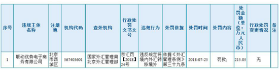 7月25日,联动优势公司因违反规定将境内外汇转移境外,被国家外汇管理局北京外汇管理部罚款215.05万元。