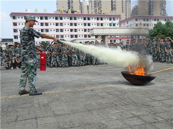 此次活动分为理论学习和灭火操作及疏散演练三部分进行。首先消防宣教人员结合学校消防安全特点,从防火、灭火常识、初期火灾的扑救方法、灭火器的使用方法、发生火灾如何报警和火场疏散逃生技能5个方面向全校师生悉心讲解。理论知识培训结束后,宣教人员带领军训学生进行灭火器扑救油盘火现场演练、零距离体验“生命通道”逃生疏散演练,亲身体验灭火,零距离接触灭火器材。