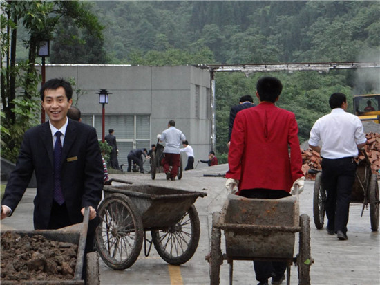 四川新闻网眉山8月31日讯(鲁学庆 王树琼 文/图) 西装革履,笑容满面,有着绅士风度的一名男士推着一辆满载泥土的推车忙碌起来。“看着伙伴们顶着烈日干活,我也来搭把手”洪雅县华生温泉酒店党支部的书记汪锐笑着说。