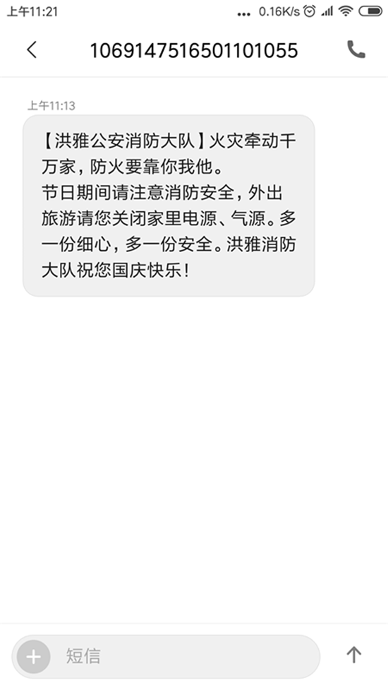 三是消防宣传教育到位,确保群众的消防安全防范意识有增无减。节日期间,洪雅大队采取各种各样的消防宣传手段,广泛深入开展消防宣传活动。大队通过手机短信的形式向市民发出消防安全防火方面的温馨提示语,努力营造节日消防安全氛围。