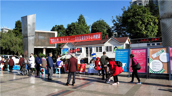 四川新闻网眉山10月11日讯(刘亚琳 底惠 文/图) 10月10日是第27个“世界精神卫生日”。今年,我国“世界精神卫生日”宣传活动以“健康心理,快乐人生——关注儿童青少年心理健康”为主题开展。昨(10)日上午9时,洪雅县精神康复医院等10余个公立和民营医疗单位在该县卫计局的组织下,在洪雅生态广场联合开展心理健康宣传和义诊活动,各乡镇卫生院义诊、宣传活动在当地同步进行,以倡导全社会关注儿童青少年精神卫生、心理健康相关知识,使家长、社会了解儿童青少年心理特点,形成全社会共同维护和促进儿童青少年心理健康的意识。