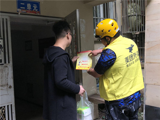 四川新闻网眉山10月16日讯(余欢 文/图) “您好,您的美团外卖到了,请查收…点美团外卖,学消防知识。这是为您免费发放的消防宣传资料,麻烦您看一看,学一点消防知识,多一份平安保障。”一名外卖“骑手”在送餐时,将消防宣传资料和餐品送到顾客手中。