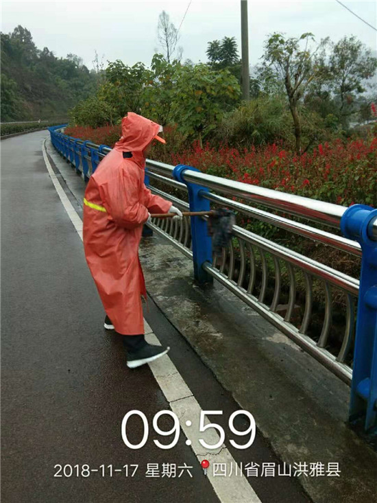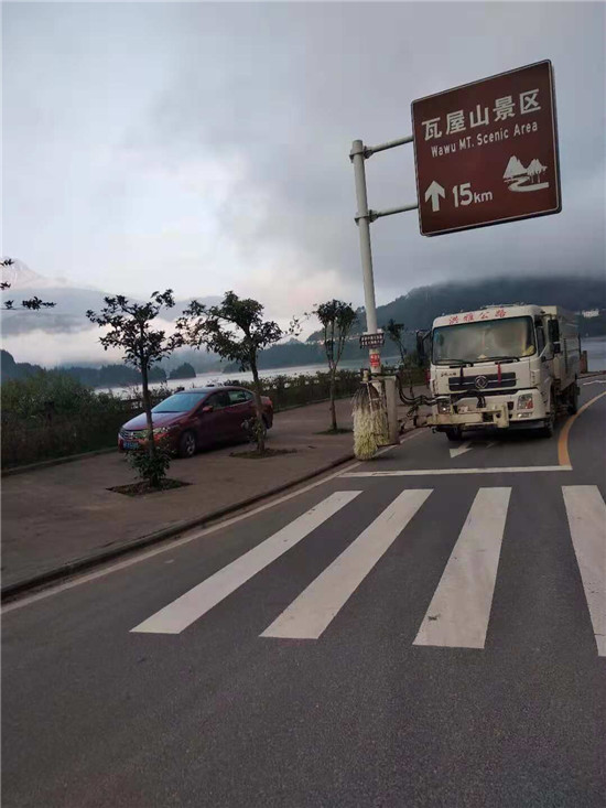 启动洒水降尘新模式。为大力推进环保工作,洪雅县养护采取“人停机不停”的工作方式,加班加点对道路扬尘进行治理。一边不断加大城市周边道路保洁力度,每天安排洒水车辆对井洪路、城乡结合部道路进行来回4次洒水冲洗,每天洒水100余吨。另一边安排清扫车对景区道路(金花桥—吴庄)路面和护栏进行冲洗,有效控制道路扬尘。