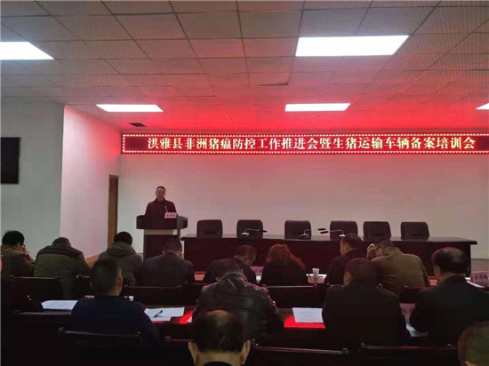 四川新闻网眉山11月28日讯 为坚决打赢非洲猪瘟防控战,有效防控非洲猪瘟疫情传播,11月22日,洪雅县农牧局召开了全县非洲猪瘟防控工作推进会暨生猪运输车辆备案培训会。全县15个乡镇政府分管领导、15个乡镇畜牧站站长、8个生猪屠宰企业共计50余人参加会议。