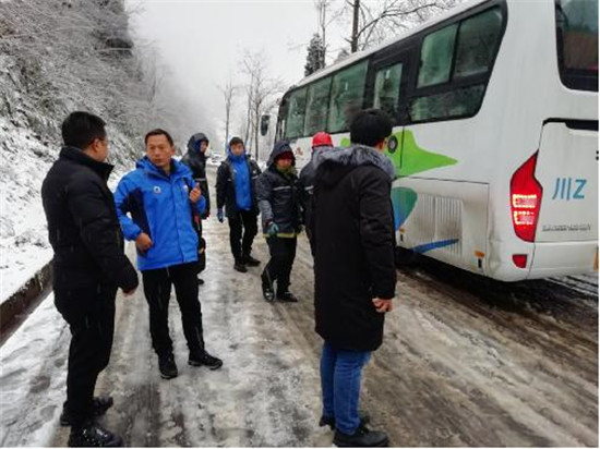 瓦屋山景区道路结冰情况严重,瓦投公司采取撒工业盐、安装防滑链、人工清扫等措施,及时清理路面积雪,保障车辆安全通行。