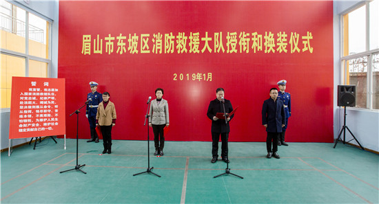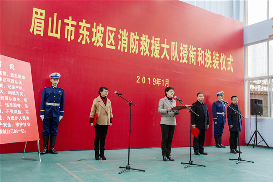 四川新闻网眉山1月4日讯(周涛 郑丽霞 文/图)2019年1月3日下午,眉山市东坡区消防救援大队举行授衔换装仪式,东坡区委书记朱莉出席仪式并讲话。朱莉代表区委、区政府向长期奋战在灭火救援和执法监督一线的消防指战员表示亲切的慰问,并致以崇高的敬意。区委常委、区政府常务副区长廖小宁主持仪式,区委常委李秋雁、区政府副区长彭盛东等区领导以及区消防救援大队全体指战员、专职消防员代表共50余人参加仪式。