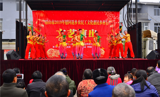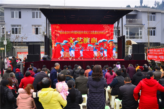 1月24日,“眉山市2019慰问返乡农民工文化惠民乡村行”巡演走进丹棱县石桥乡界牌村,该巡演活动依托丹棱县作平文化院坝,在全市各区县开展“送文化下乡”,营造欢乐祥和的节日气氛,让城乡老百姓共享文化成果,为全市各区县返乡农民工、农村群众送去党和政府的关心,送去新春的祝福。