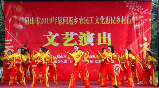 四川新闻网眉山1月29日讯(吴媚 文/图)为营造欢乐祥和的春节节日氛围,丰富基层职工群众文化生活,慰问返乡农民工,让老百姓共享文化成果。由眉山市总工会、眉山市文化和旅游局开展的眉山市2019年春节慰问返乡农民工文化惠民乡村行活动分别在仁寿县满井镇、青神县瑞峰乡、彭山区观音镇、东坡区复盛乡、洪雅县槽渔滩镇、丹棱县石桥乡举行。文化志愿者们向广大农民工朋友送上真诚的祝福和亲切的慰问,使他们感受到党和政府的关心和工会组织的温暖。