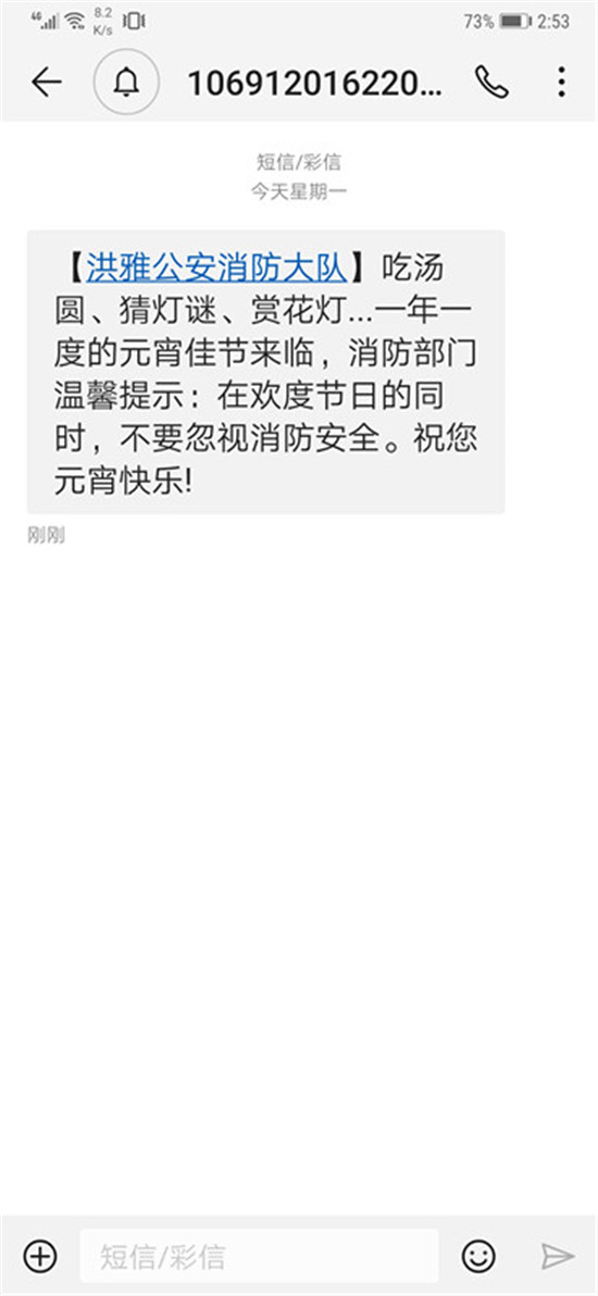 四川新闻网眉山2月18日讯(余娟 文/图)为确保全县人民平安快乐地度过元宵节,近日,洪雅县消防大队借助短信网络平台优势,传播消防安全知识,提醒群众过节注意消防安全,避免火灾悲剧发生。