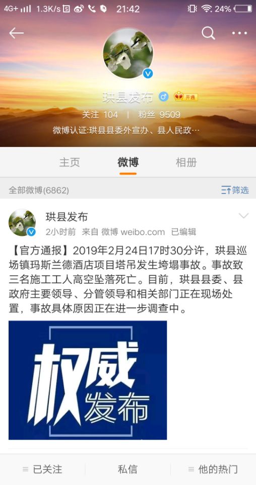 四川新闻网宜宾2月24日讯(记者 周瑜原)2月24日,记者从珙县县委外宣办、珙县人民政新闻办官方微博“珙县发布”获悉,2月24日17时30分许,珙县巡场镇玛斯兰德酒店项目塔吊发生垮塌事故。事故致三名施工工人高空坠落死亡。目前,珙县县委、县政府主要领导、分管领导和相关部门正在现场处置,事故具体原因正在进一步调查中。