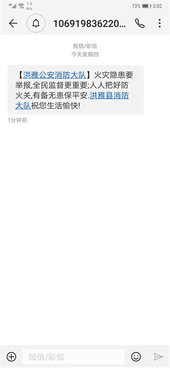 3月21日,洪雅消防大队充分发挥手机短信覆盖面广、普及率高、言简易记的优势,精心编写了通俗易懂,贴近生活、贴近实际的火灾防控顺口溜,以手机短信的形式把消防知识送到千家万户,提示广大人民群众要留心身边的消防安全,发现火灾隐患要及时举报。