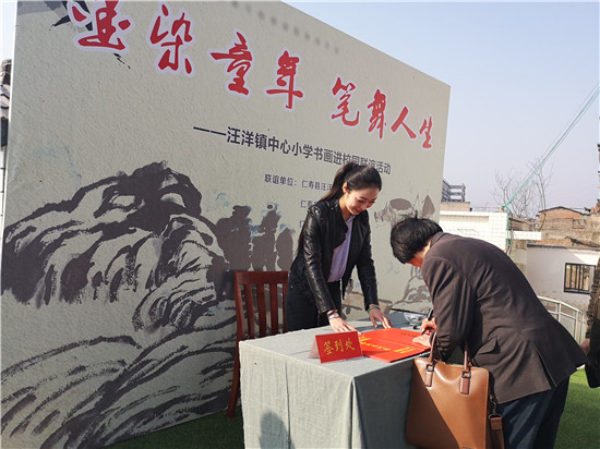 欢迎仪式上,汪洋小学校长致欢迎辞,仁师附小校长、县美协、书协主席发表讲话。捐赠仪式上,仁寿县青少年宫和汪洋小学完成捐赠交接仪式。